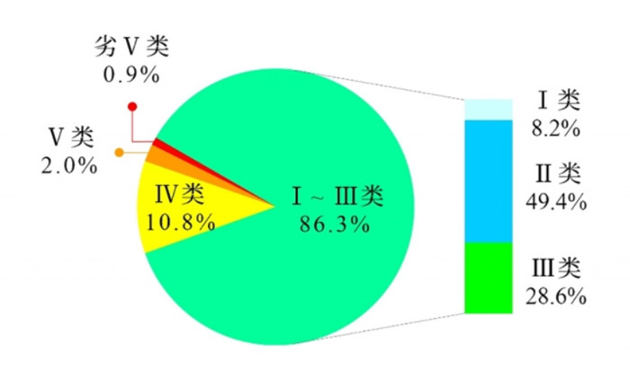 1—9月全國地表水水質類別比例。